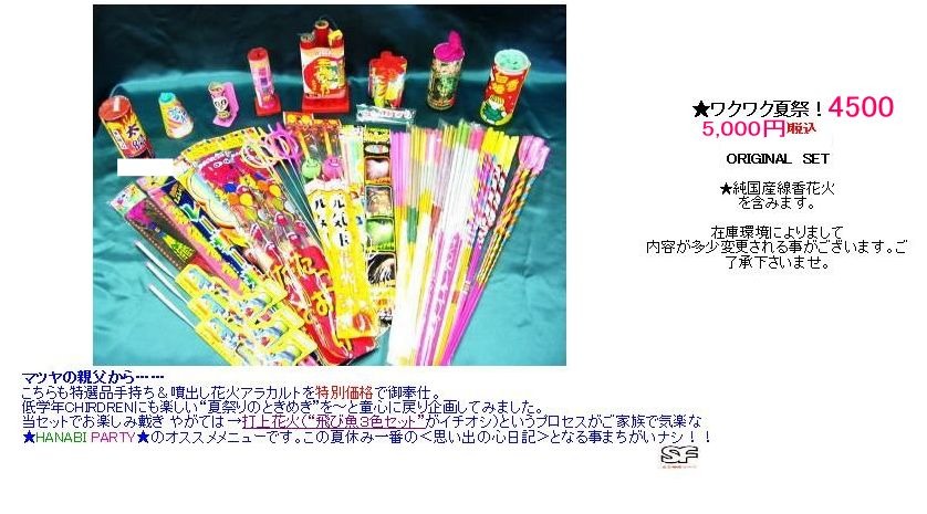 現在は中国製噴出花火6個&国産線香花火6本を含む総計64本編集とさせて頂いております。